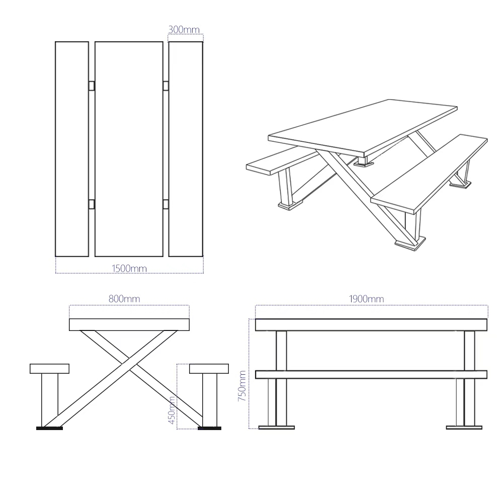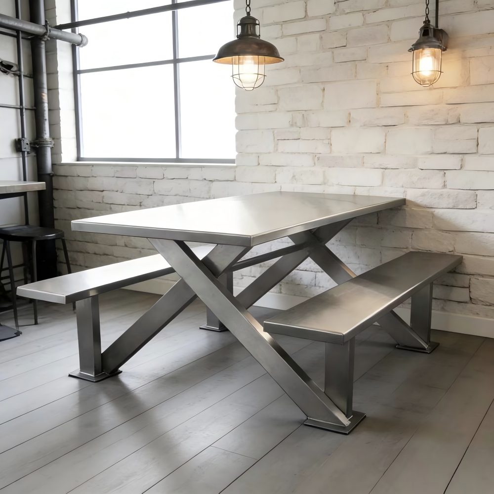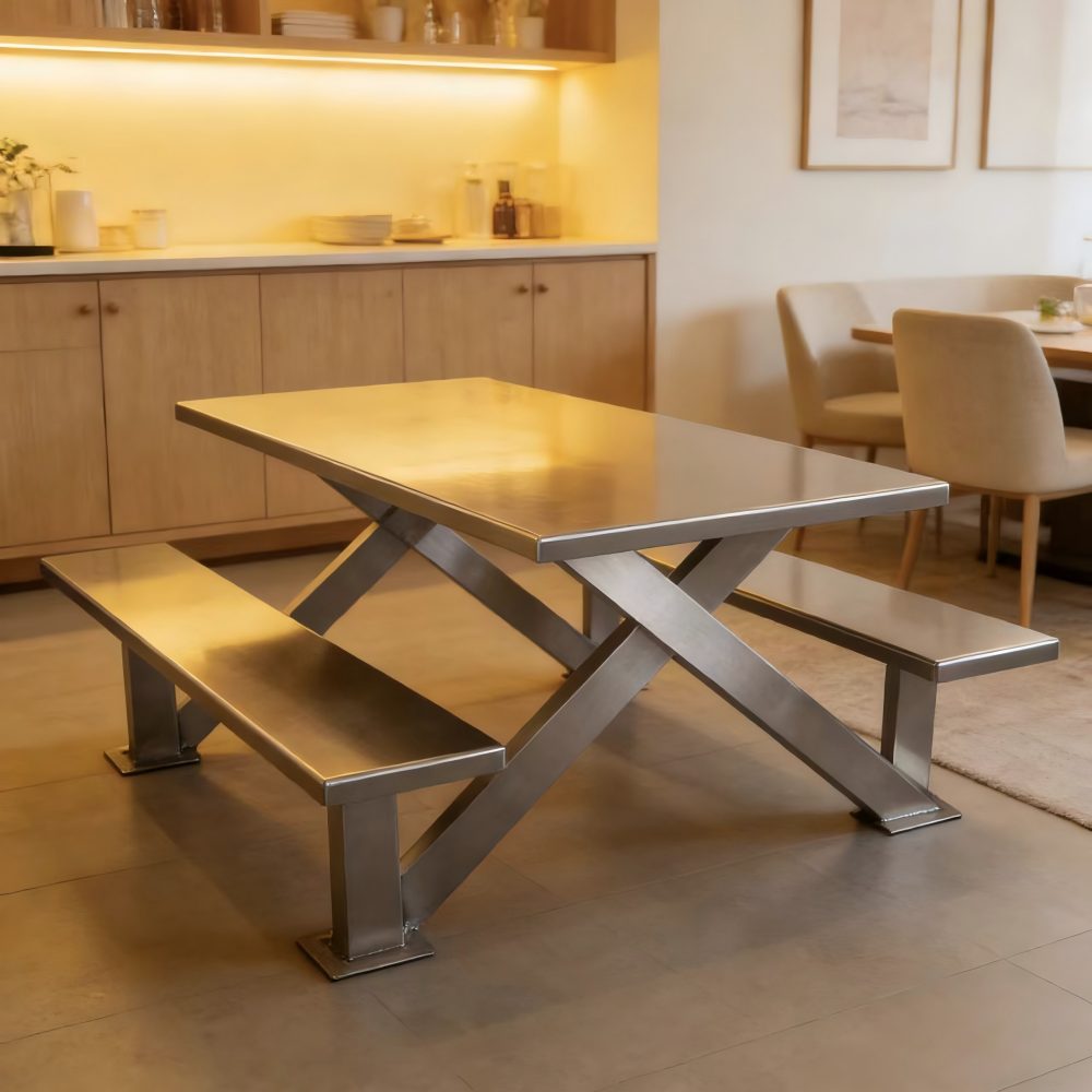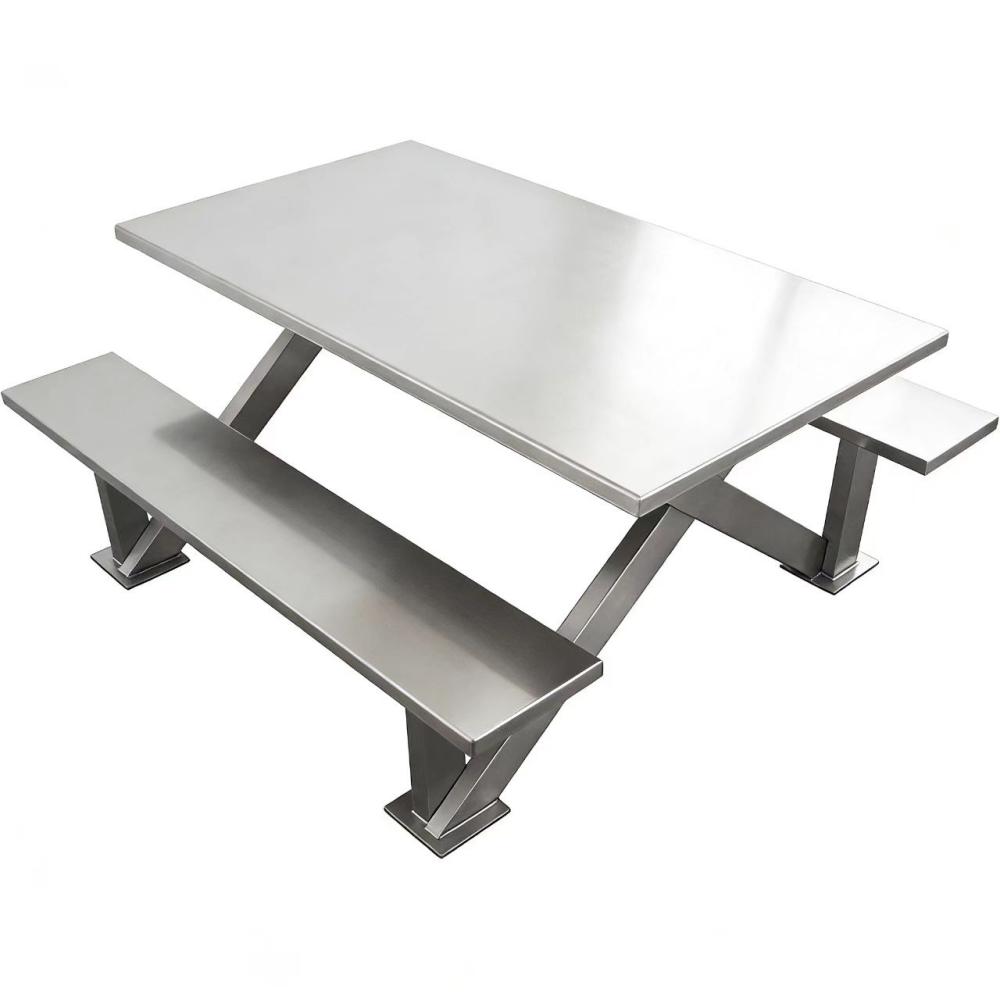 This stainless steel rectangular dining table adopts the classic X-shaped cross support structure, which can firmly connect the dining table to the benches on both sides, preventing the chairs from shaking back and forth, thereby enhancing the stability and load-bearing capacity of the dining table.
