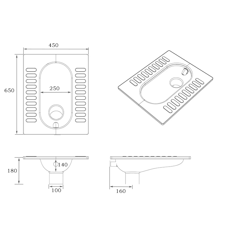 The dimensions of this four-sided water outlet squat toilet are 650*450mm, with a height of 180mm. It can also be installed with an S-bend for odor prevention, with an overall height of 280mm. Its feature is four-sided water outlet, and the drainage outlet is at the back