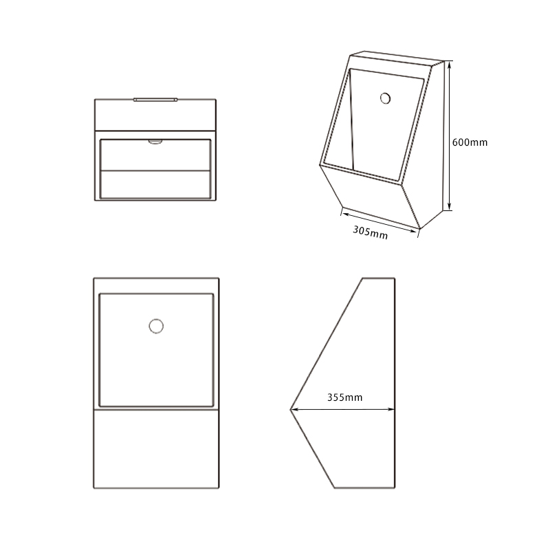 The dimensions of this urinal are 305mm*355mm, with a height of 600mm. The urinal can be wall drained or floor drained, and the flushing is automatic sensing flushing