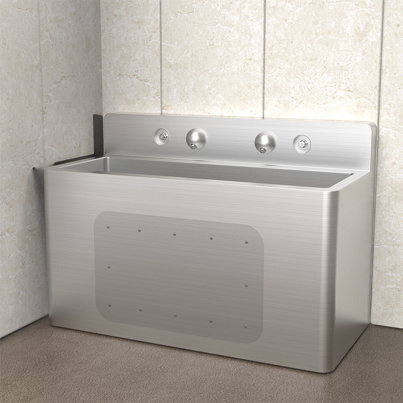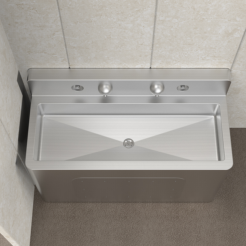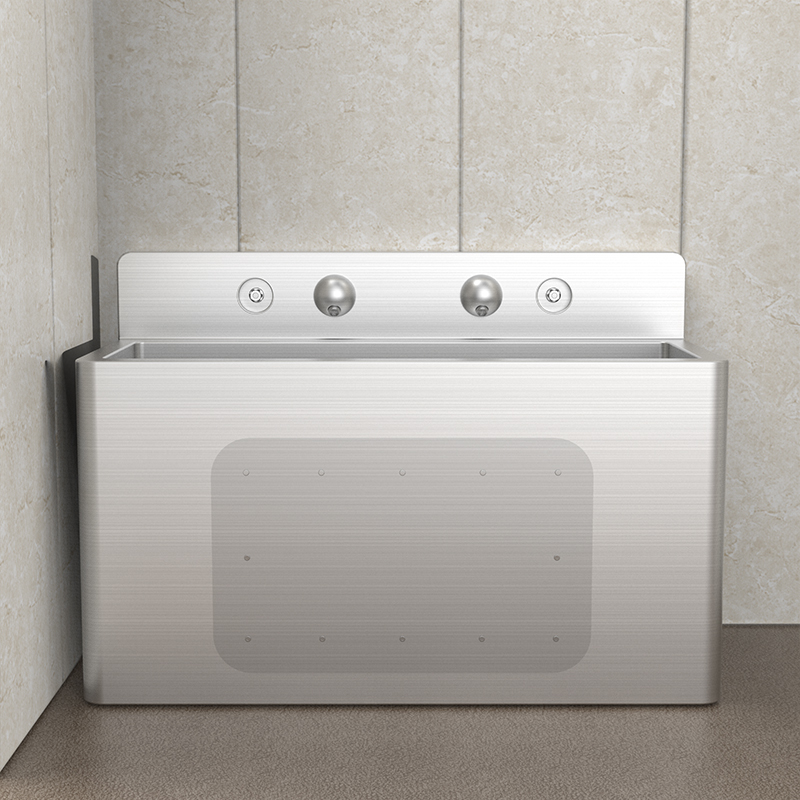 This is a floor standing rectangular full-length sink made of 304 stainless steel material. The height is 800 millimeters and adopts a large R-angle design. The faucet is circular, and the outlet is honeycomb shaped.
